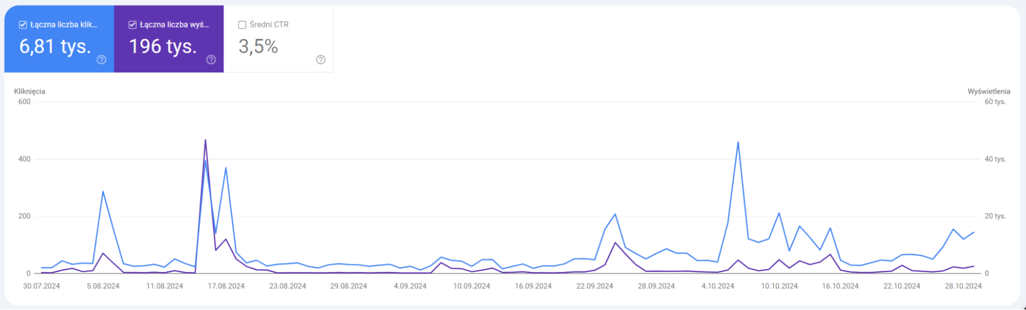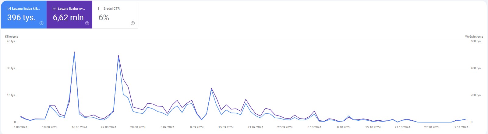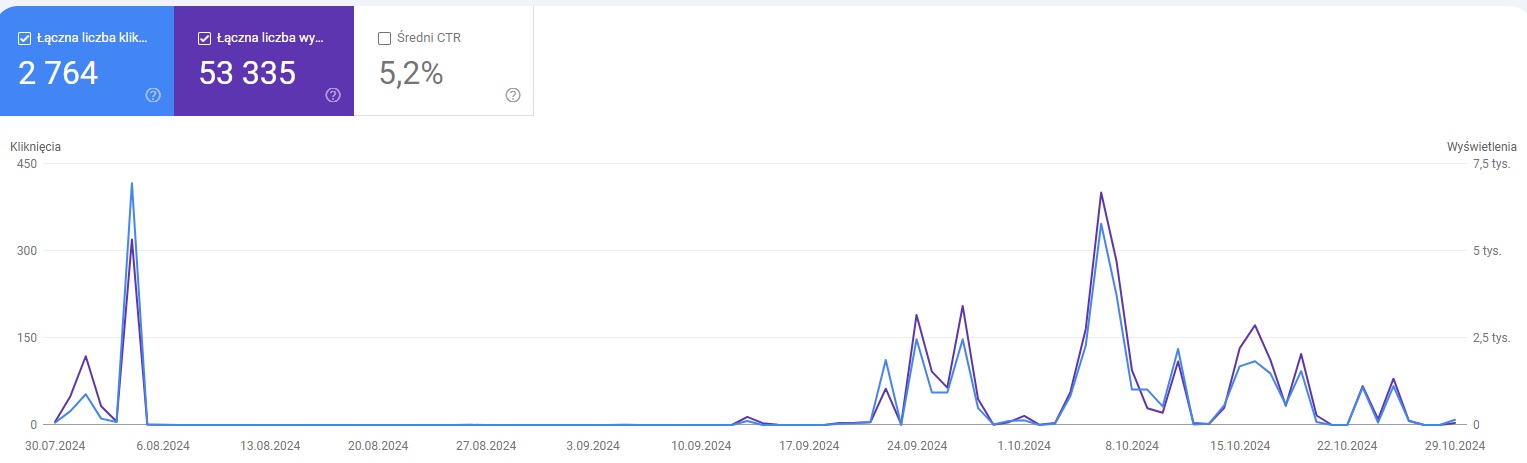 Discover może dostarczyć na stronę dodatkowy ruch organiczny. Ma on zastosowanie zarówno w sklepach internetowych, jak i na blogach. Poniżej trzy wykresy prezentujące liczbę wyświetleń i kliknięć z kart Discover wygenerowanych w ciągu kwartału.