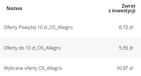 Działania rozpoczęliśmy od włączenia kampanii ofert sponsorowanych. Na pierwszy cel postanowiliśmy wziąć poprawę wartości ROAS. Nie było to łatwe zadanie, biorąc pod uwagę, że ponad połowa ofert w sklepie Allegro (czyli ponad 3 tys.) ma cenę poniżej 10 zł. Wiąże się to z kilkoma trudnościami, o których musimy pamiętać w trakcie pracy z takim asortymentem: