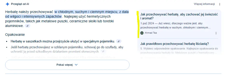 Dzięki kompleksowym działaniom SEO - od przywrócenia indeksacji, przez Audyt SEO i optymalizację drzewa kategorii, treści i metadanych, aż po regularny rozwój bloga - udało się znacząco poprawić widoczność sklepu Ahmad Tea w wynikach organicznych. Sklep, który wcześniej praktycznie nie istniał w Google, zaczął pojawiać się na coraz większą liczbę istotnych zapytań, zarówno brandowych, jak i produktowych, co widać na załączonym screenie: