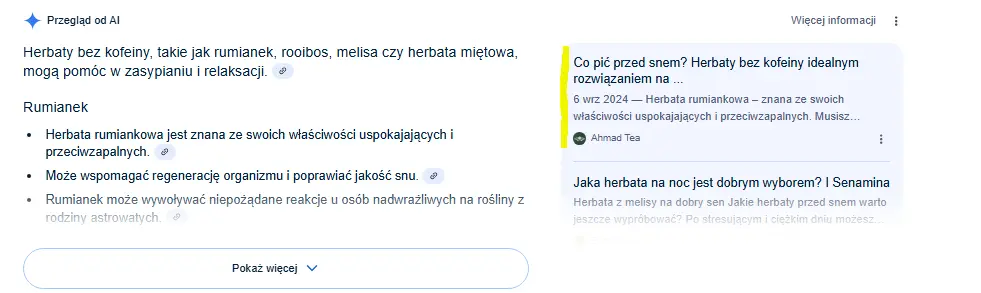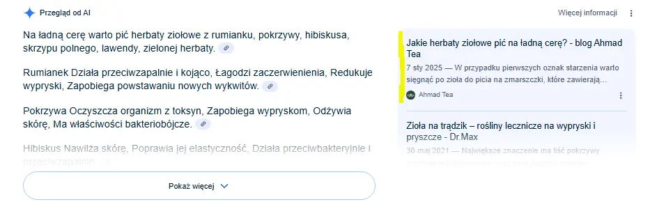 Co ważne, od wielu miesięcy dostosowujemy nasze działania również do AI Overview - nowej funkcji Google, która niedawno została udostępniona także dla użytkowników w Polsce. AI Overview to inteligentne streszczenia, które Google generuje na górze wyników wyszukiwania, prezentując najważniejsze informacje na dany temat w formie zwięzłych podsumowań opartych na źródłach z sieci. Aby mieć szansę pojawić się w tych odpowiedziach, treści muszą być precyzyjnie sformułowane, klarowne, zgodne z intencją użytkownika i dobrze zoptymalizowane pod względem językowym i technicznym.