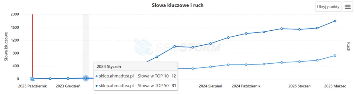 W marcu 2024 roku rozpoczęliśmy współpracę z marką na rynku polskim. Celem było zwiększenie widoczności sklepu internetowego https://sklep.ahmadtea.pl/ w wynikach organicznych Google. Głównym problemem z którym zetknęliśmy się na początku było to, że strona nie była praktycznie obecna w wyszukiwarce - nawet na zapytania brandowe.