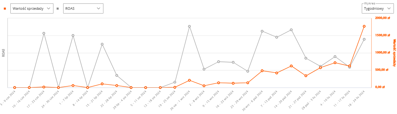 Mimo niższych stawek CPC i spadku liczby odsłon oraz wizyt oferta notowała zbliżony poziom sprzedaży, jednak tym razem niższym kosztem, co przełożyło się na poprawę wskaźnika ROAS.