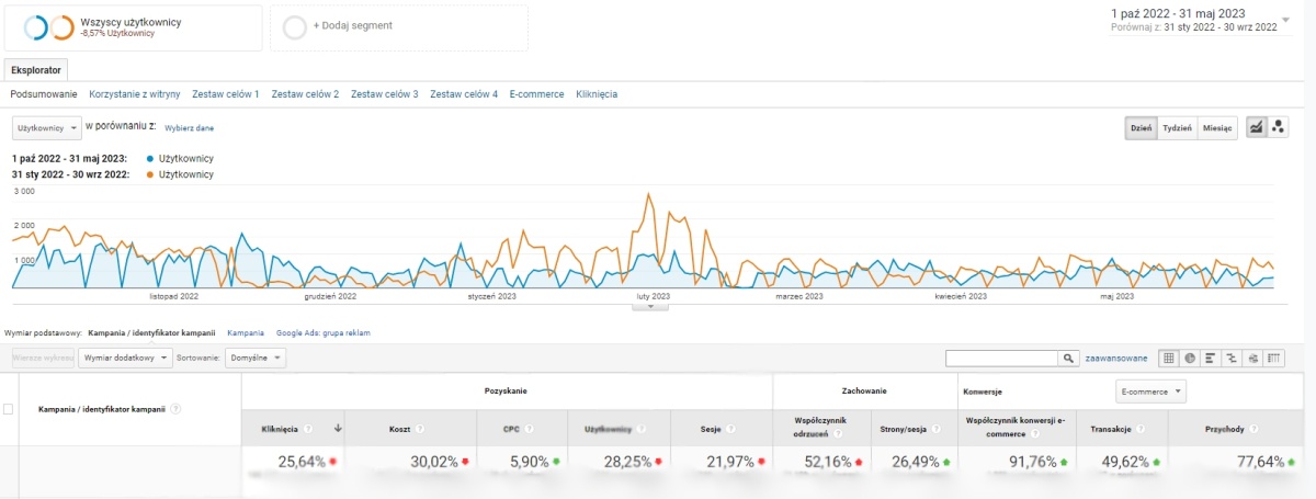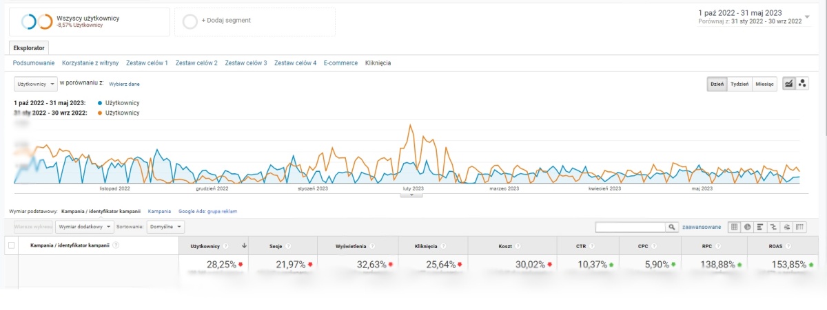 Współpraca trwająca niespełna rok przyczyniła się do znacznego wzrostu obrotów! Wyniki od początku naszej współpracy (1 października 2022) do końca maja 2023 roku w porównaniu do poprzedniego okresu, to: