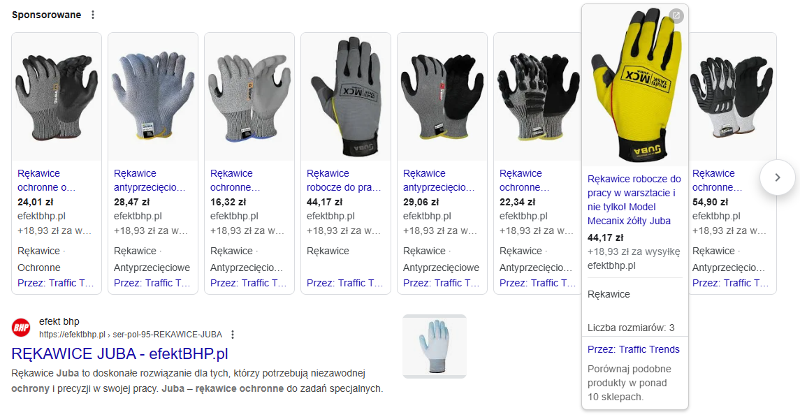 W przypadku sklepu Efekt BHP postanowiliśmy pójść o krok dalej i zdecydowaliśmy się na strategiczne wyodrębnienie najlepiej prosperującej marki do osobnej, dedykowanej kampanii Performance Max. Takie podejście umożliwiło przede wszystkim jeszcze precyzyjniejsze dostosowanie budżetu reklamowego oraz strategii ustalania stawek pod potrzeby jednej marki. Dzięki temu rozwiązaniu kampania mogła w pełni skupić się na promocji kluczowej marki, co przełożyło się na lepszą kontrolę nad jej widocznością i efektywnością sprzedażową.