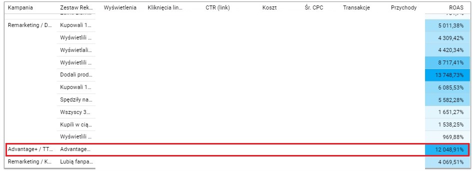 Kolejną strategiczną decyzją było wdrożenie najnowszej, zautomatyzowanej kampanii Advantage+, umożliwiającej skuteczniejsze dopasowanie materiału reklamowego do odbiorcy, dzięki której w krótkim czasie osiągnęliśmy spektakularne efekty: