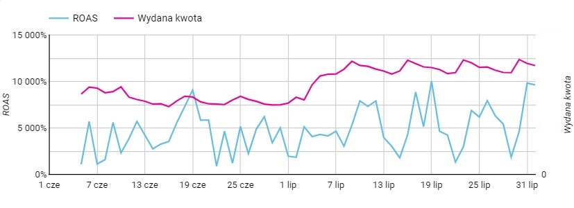 Już po 30 dniach od rozpoczęcia prowadzenia działań reklamowych, kampanie osiągnęły ROAS ponad 4000%, a my, po dogłębnej analizie dotychczasowych wyników, byliśmy w stanie wyszczególnić najbardziej skuteczne metody kierowania i rozpocząć intensywne działania, pozwalające rozwijać potencjał kampanii reklamowych.