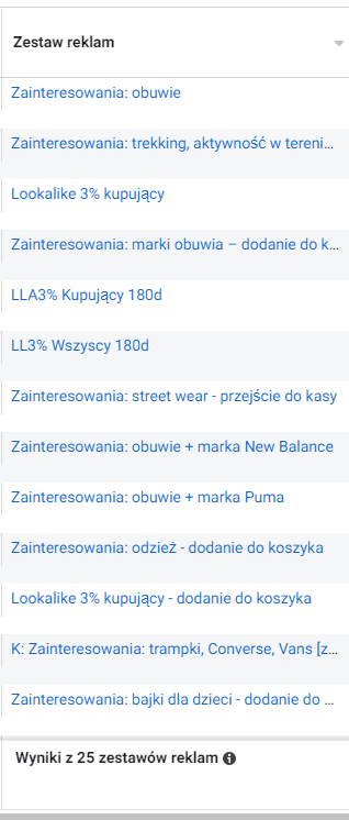 Jak widzicie powyżej, testowane były różnorodne grupy. W grupach tych dodatkowo sprawdzaliśmy różnorodne grupy produktów w osobnych wariantach reklam np. bestsellery wytypowane na podstawie danych z Google Analytics, zestawy produktów dostosowane do sezonu, obuwie dziecięce, obuwie męskie, obuwie damskie…