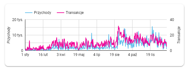 Wykres wzrostu liczby przychodów i transakcji w 2022 roku.