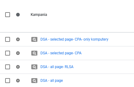 Przed podjęciem współpracy, podczas audytu konta Google Ads, zauważyliśmy, że Klient prowadził cztery równoległe kampanie DSA.